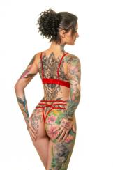 Gorący komplet wykonany z najwyższej jakości lacku połączonego z delikatnymi gumeczkami. Staniczek "otwarty", zapinany z tyłu na dwurzędowe haftki. Ramiączka cienkie, regulowane. Stringi "otwarte" ozdobione z przodu, podobnie jak stanik drobnym kwiatuszkiem z cyrkonią po środku.