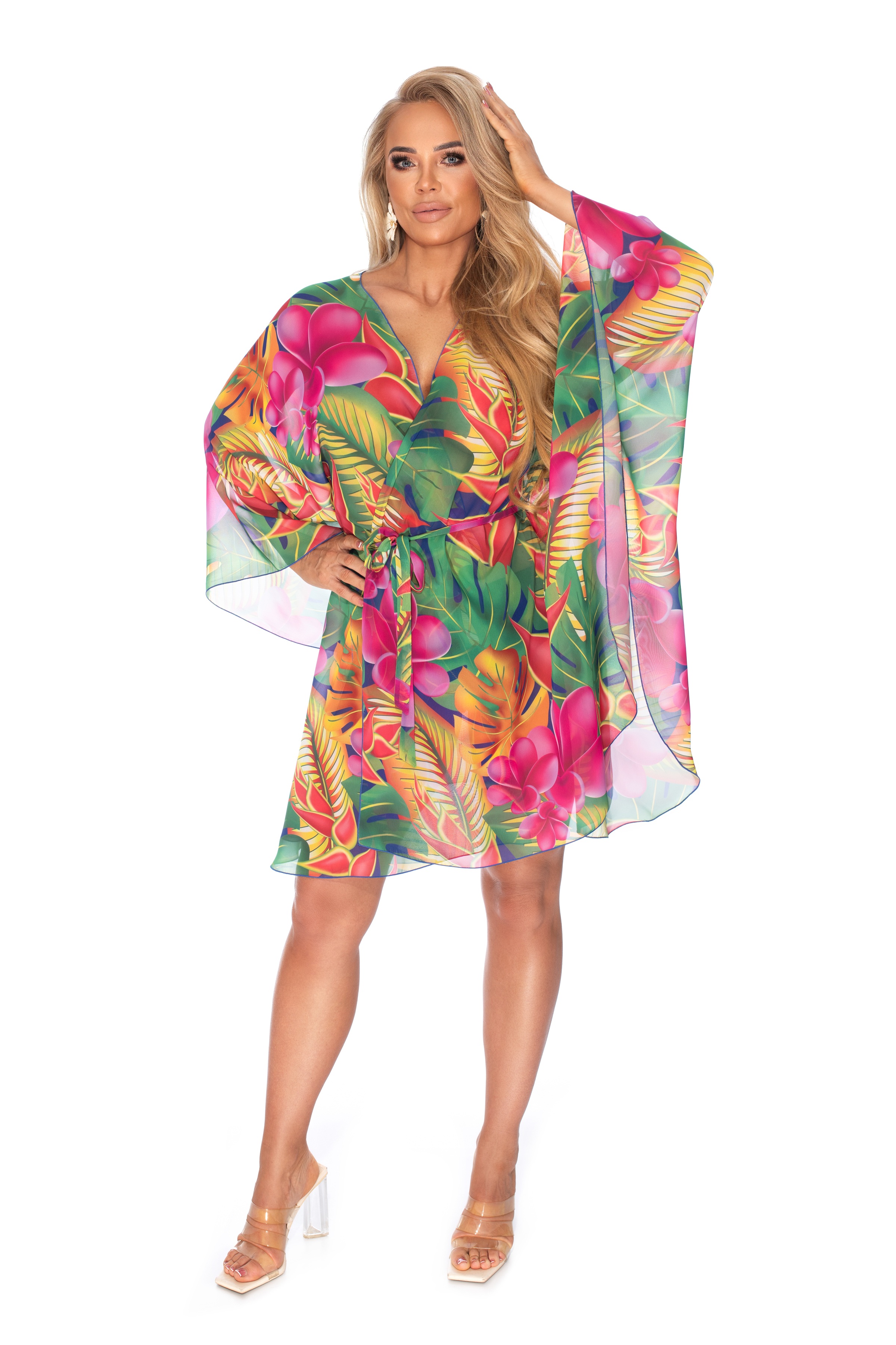 Zwiewna i delikatna tunika wykonana z wzorzystego szyfonu. Idealna na plażę i nie tylko. Rozcinana z przodu. Kimonowe rękawy. Wiązana w pasie paskiem. Szybkoschnąca. Rozmiar uniwersalny - obwód do 130 cm (biust / talia / biodra). Wyprodukowana w Polsce.